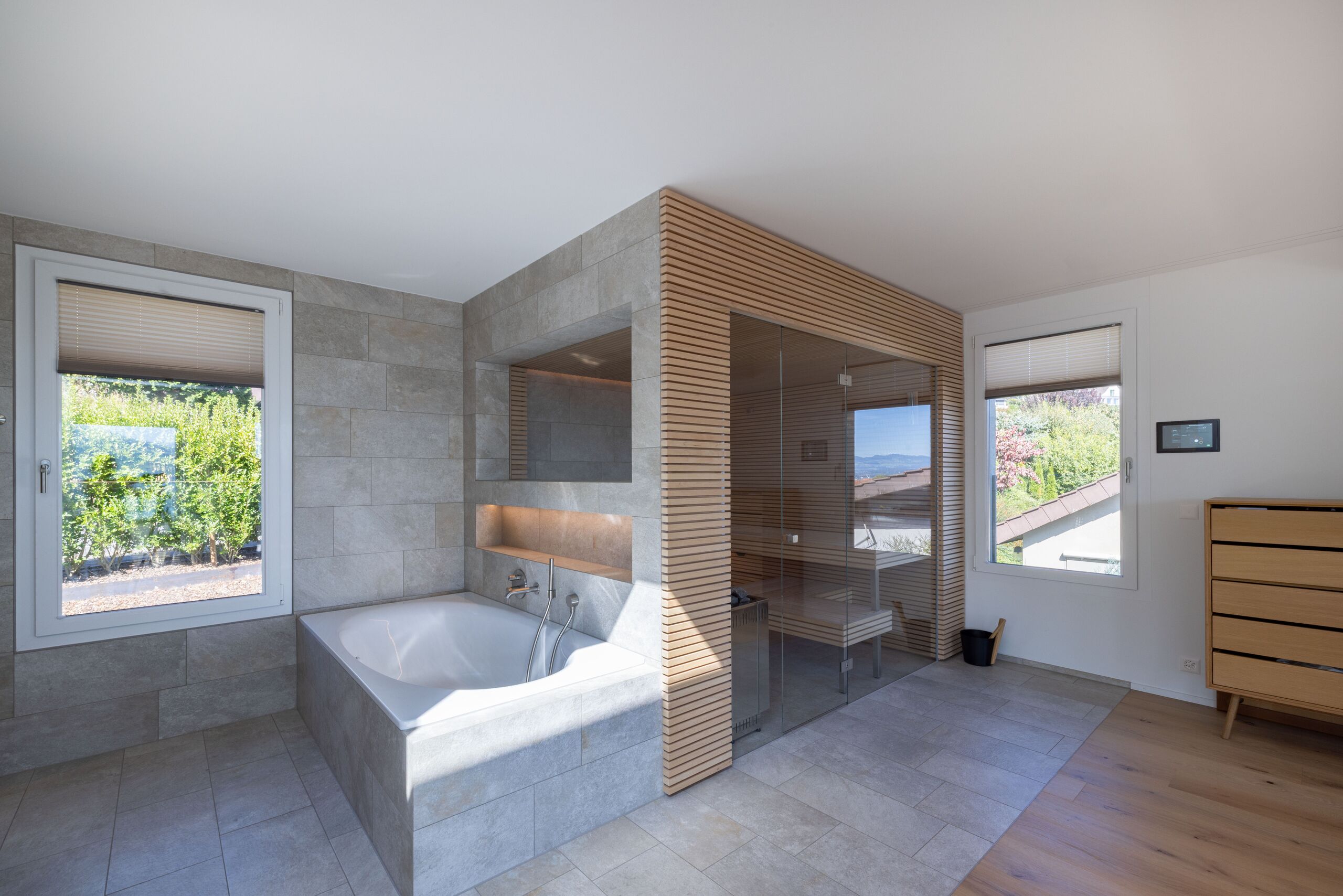 - High-quality materials: natural stone, parquet flooring from Scheucher, designer lighting