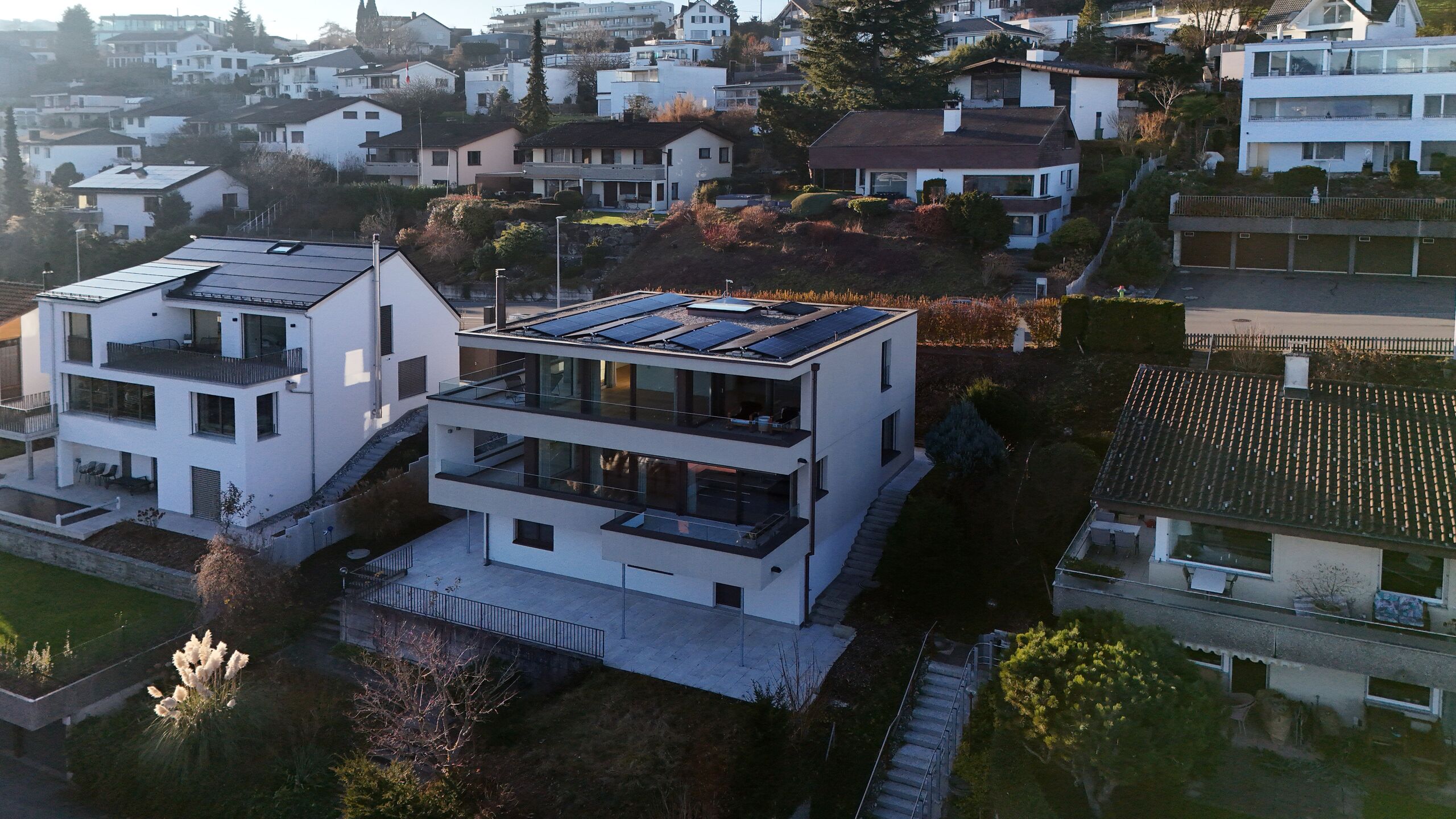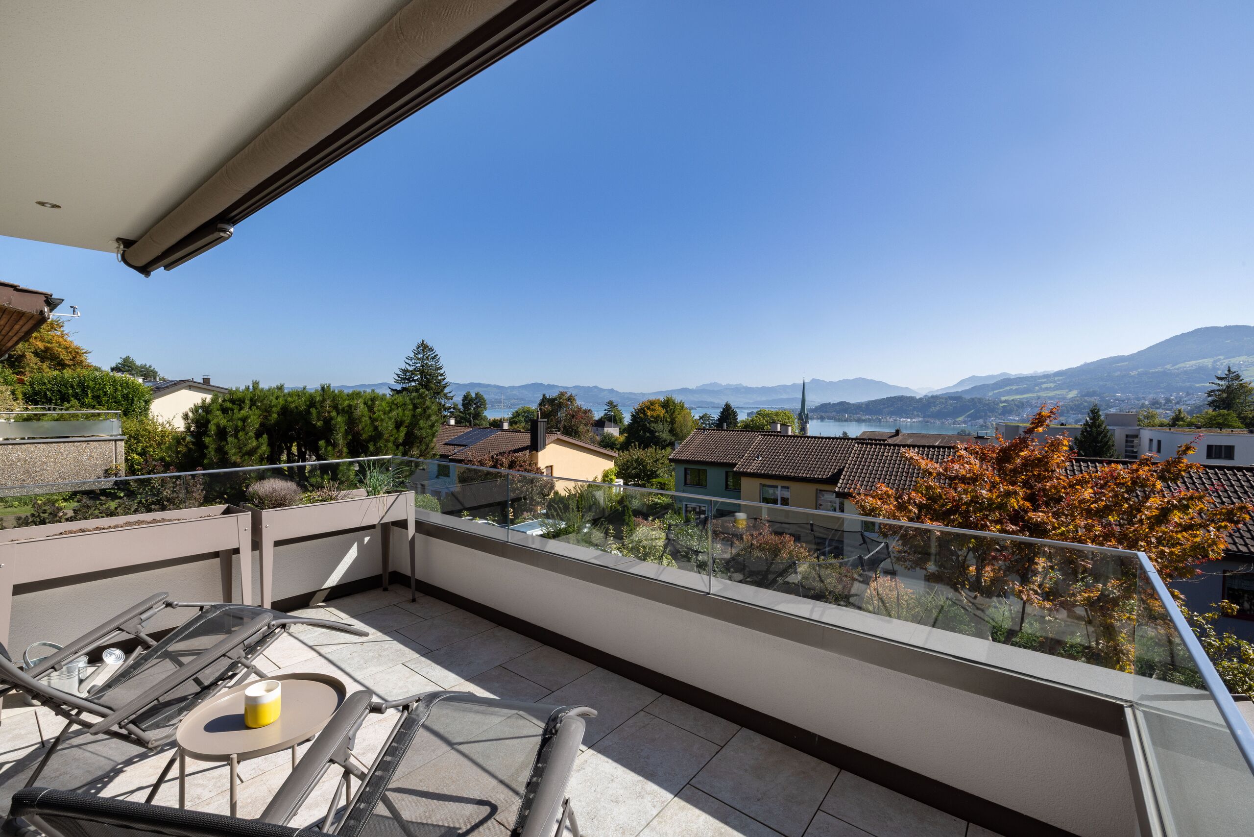 This exclusive 7.5-room single-family home impresses with its dreamlike, quiet location with unparalleled lake views and two spacious, covered terraces (with loggia) that invite you to linger even when it rains and offer spectacular panoramic views.