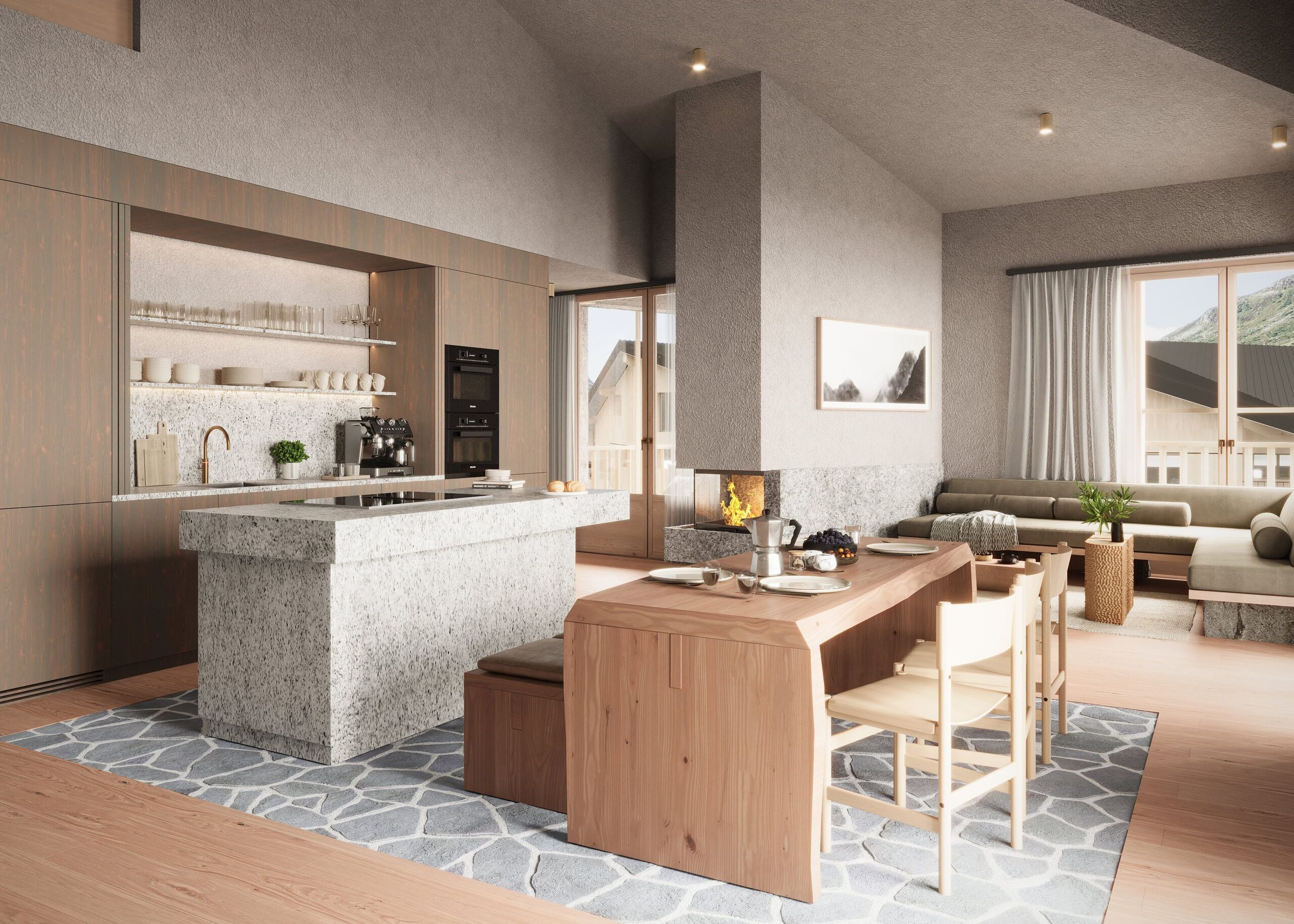 TØVA is an architectural masterpiece by Norwegian star architects Jensen & Skodvin, combining Nordic aesthetics with alpine elegance. Set amid the breathtaking landscape of Andermatt, it offers light-filled rooms with warm natural materials that invite you to linger. Residents enjoy exclusive amenities such as a wellness area with sauna, a private cinema, a stylish lounge and a modern gym – perfect for harmoniously combining relaxation, socialising and activity.